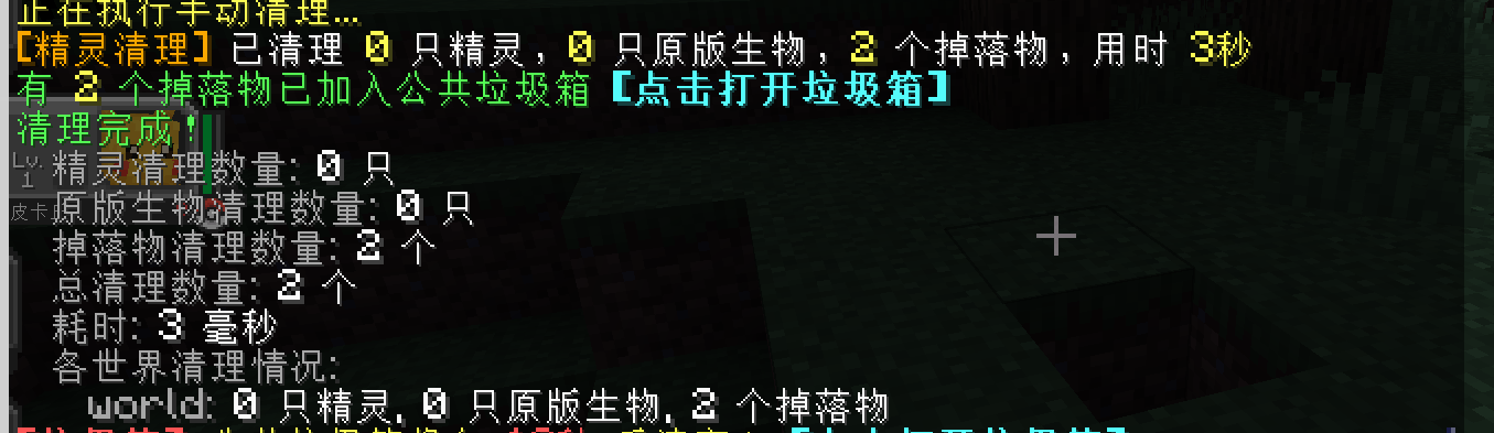新功能 公共垃圾箱系统 掉落物回收 - 被清理的掉落物自动保存到公共垃圾箱,玩家可在清空前取回 独立倒计时 - 垃圾箱有自己的清理间隔,与主清理器独立运行 数据持久化 - 服务器重启后垃圾箱物品和倒计时自动恢复 分页浏览 - 支持翻页查看大量物品 CustomModelData - GUI按钮支持自定义材质贴图 公告系统 倒计时警告 - 在 60秒、30秒、10秒、5秒 时提醒玩家取回物品 清理完成通知 - 垃圾箱清空时广播清理数量 可点击消息 - 聊天栏点击即可打开垃圾箱 物品保护 环境伤害保护 - 玩家丢弃的物品被仙人掌、岩浆、火焰销毁时自动保存 延迟保护 - 可配置保护时间(默认6秒内) 玩家通知 - 物品被保存时可选择通知玩家 世界名称映射 支持将英文世界名映射为中文显示 垃圾箱物品显示来源世界的中文名称 命令 /pokemoncleaner trash - 打开公共垃圾箱 /pokemoncleaner trashbin - 同上 /pokemoncleaner 垃圾箱 - 同上 配置文件新增 trashbin.yml 配置文件: 清理间隔设置 GUI 外观自定义 公告消息自定义 世界名称中文映射 优化 修复 GUI 倒计时显示不正确的问题 修复重载配置时任务重复的问题 优化 GUI 刷新机制,每秒动态更新标题 代码整体重构,修复清理时服务器卡顿问题 权限 pokemoncleaner.trashbin - 使用公共垃圾箱