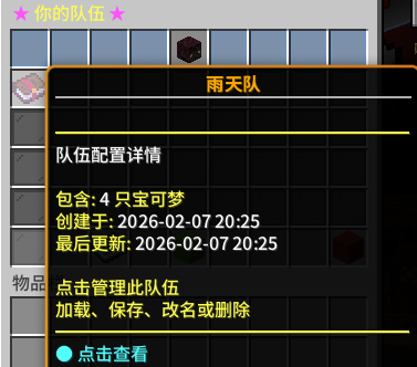 **保存队伍** 将当前队伍的 1-6 只宝可梦保存到指定配置