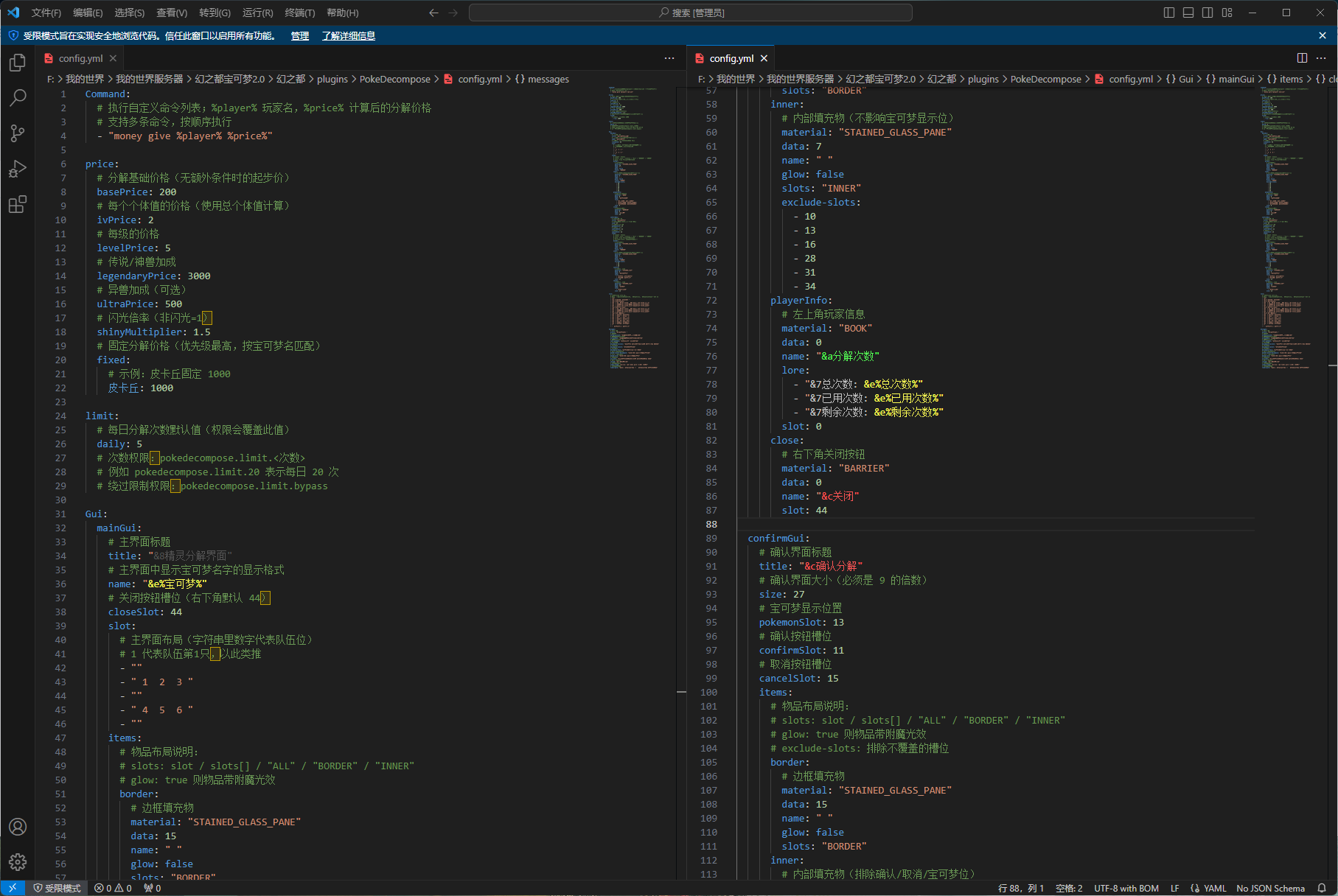 Zero3 提交新资源: 【宝可梦分解】PokeDecompose——超高自定义的宝可梦分解~ - 让玩家消耗精灵来获取奖励吧,不仅仅是金币哦! 配置布局参考了丝袜哥的回收插件RePokeFJ (真的好用,但是有点小瑕疵)https://bbs.mc9y.net/resources/1274/ 感谢丝袜哥~ 本身想要收费来着,但是考虑到自己第一次尝试发布插件,可能有很多问题,所以转免费 游戏内截图: 浏览附件14982浏览附件14983 配置文件截图: 浏览附件14980 浏览附件14981 GUI布局和Lore均可以自定义!!! 命令: /pokedecompose(pd) 打开分解界面 /pd... 点击展开... 阅读关于此资源更多信息...