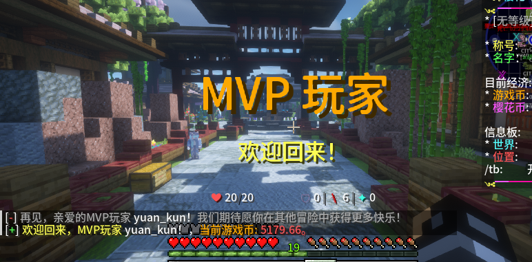 yuan_kun 提交新资源: VipMessage — VIP用户专属消息「1.13~1.20」 - 根据用户的VIP级别或其他个性化信息,显示相应的欢迎词或特权信息,增强用户体验 功能简介: 在大屏幕上以突出的字体显示欢迎词或特别消息,让用户感受到被重视 当VIP用户成功登录时,播放特定的提示音,让用户感受到特别待遇 根据用户的VIP级别或其他个性化信息,显示相应的欢迎词或特权信息,增强用户体验 命令/权限: /vipmessage reload 重载 请给你权限组添加以下权限 权限:VipMessage.Default 权限:VipMessage.VIP 权限:VipMessage.SVIP 权限:VipMessage.MVP 浏览附件10571 点击展开... 阅读关于此资源更多信息...